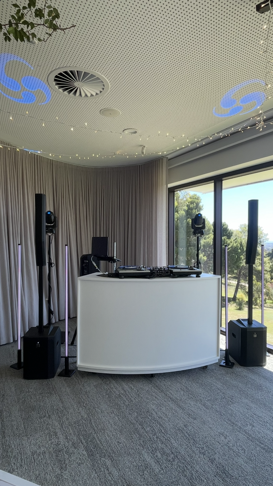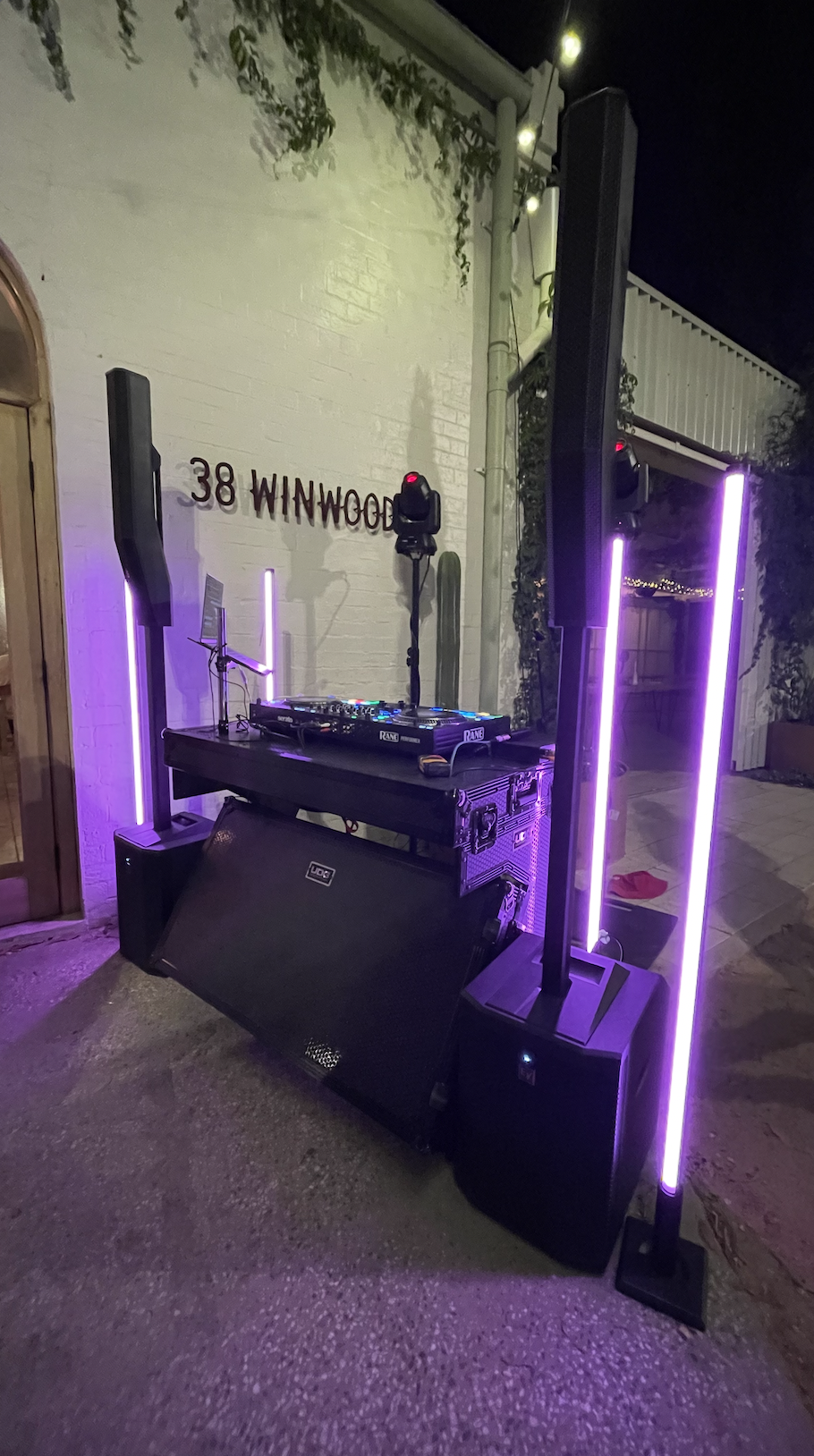Evolve EV Column Speakers with Subwoofers and a sleek DJ booth. A powerful, clean, and elegant sound setup that photographs beautifully and keeps the dance floor shaking once formalities are done. I also supply a Sennheiser Wireless Microphone with stand for flawless speeches and announcements. Crisp audio for all your key moments.