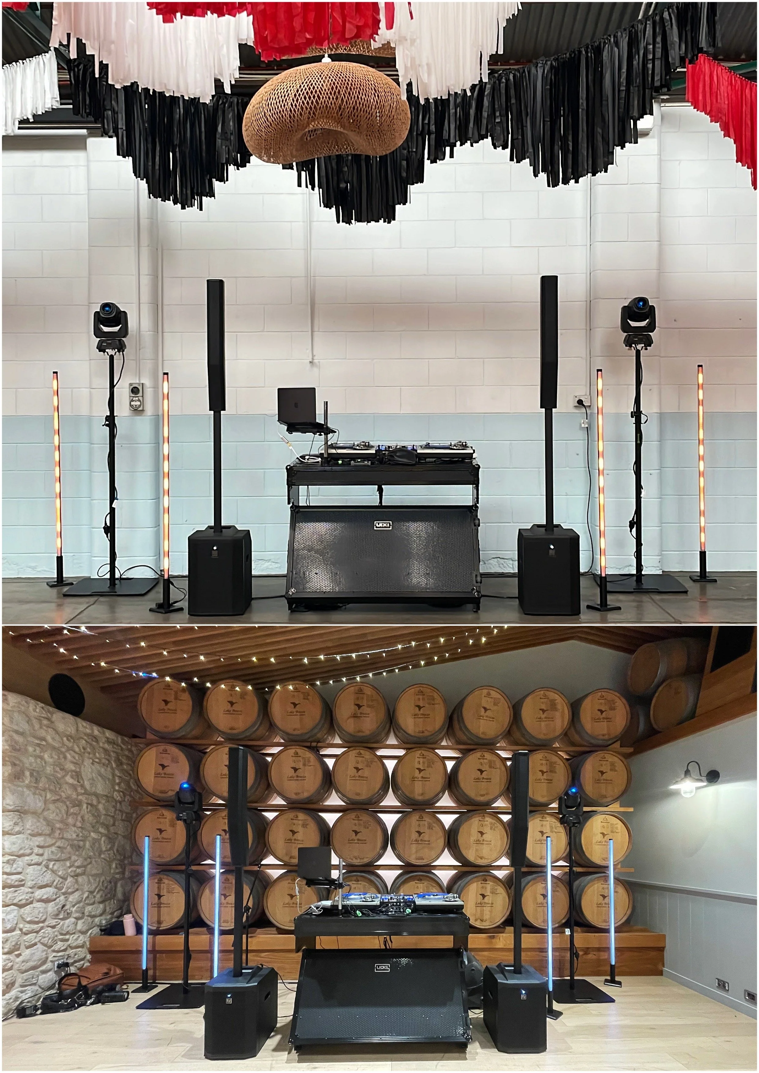 Sleek, professional, and powerful. My setup features the EVOLVE 30M column speaker system with subs for crystal-clear sound, a stylish DJ booth, premium DJ equipment, a wireless microphone for speeches, and full lighting package to set the perfect mood and bring your venue to life.
